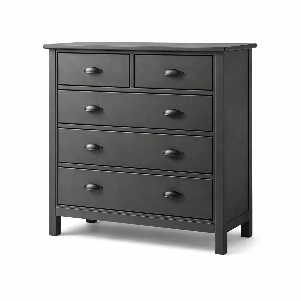 Design : Comporte 5 tiroirs pour le rangement de vêtements et objets divers.